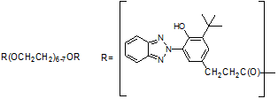 化學名稱 | 紫外線吸收劑UV-1130為苯并三唑混合物:b-[3-(2-H-苯并三唑-2-基)-4-羥基-5-叔丁基苯基]-丙酸聚乙二醇300酯,雙-{b-[3-(2-H-苯并三唑-2-基)-4-羥基-5-叔丁基苯基]-丙酸}-聚乙二醇300酯,聚乙二醇300 | ||||||